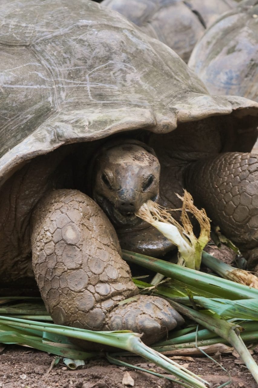 - Larger tortoises, like Aldabra or Galapagos tortoises, can consume grass or alfalfa hay along with a complete pelleted food formulated for tortoises or exotic herbivores. The hay should be cut short to accommodate the mouth shape of these tortoises.