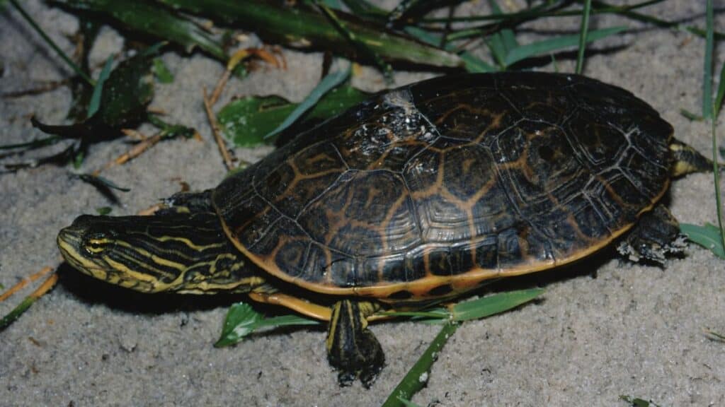 Chicken turtles are characterized by their extremely long neck and distinctive net-like pattern on their upper shell. This neck is so ridiculously long that it’s like nature decided to give a turtle a snake accessory.