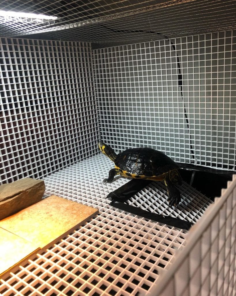 This DIY basking spot only going to make your turtles happy but also increase the aesthetics of your turtle’s tank. This white above-tank basking spot is made with egg crate and the turf grass base gives it a splash of green.