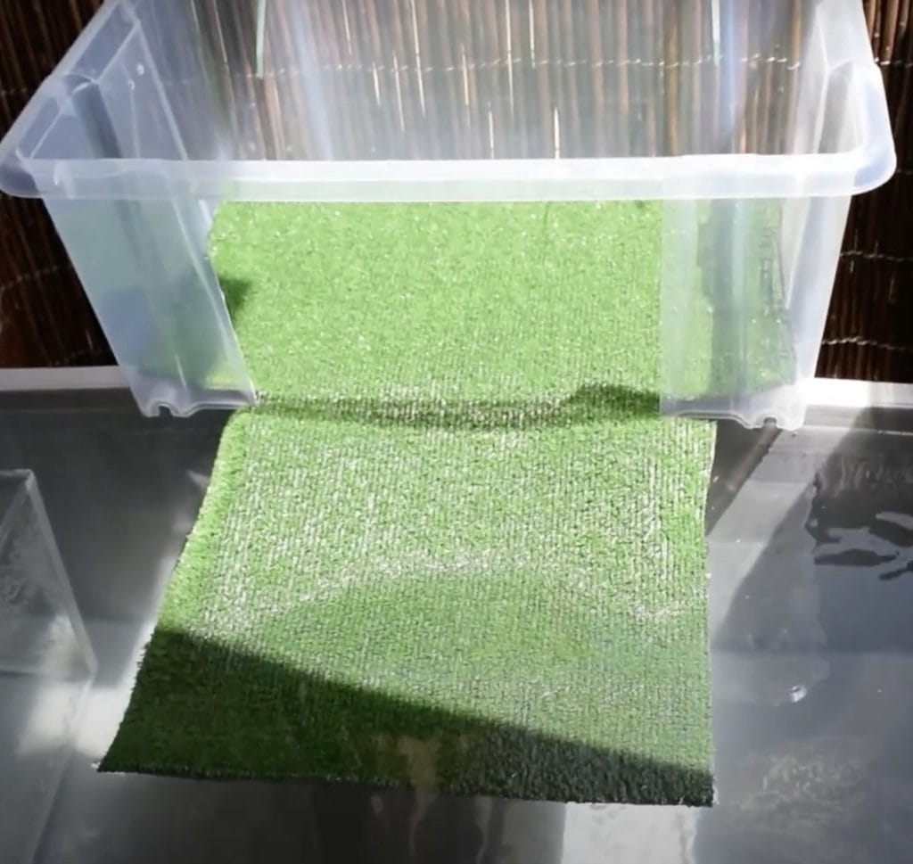 | Materials | Artificial grass, aquarium rocks, plastic tote, egg crate |