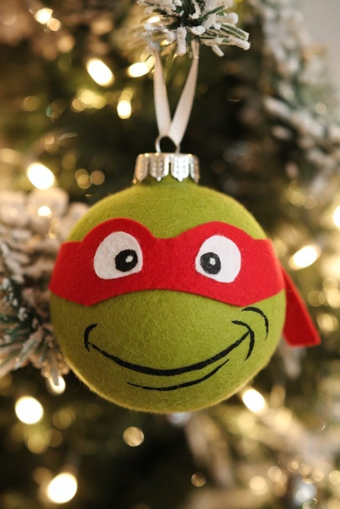 Finally, attach a hook or tie a ribbon through the top of the ornament to hang it on your tree. And just like that, you have a cute Ninja Turtle ornament ready for your Christmas tree!