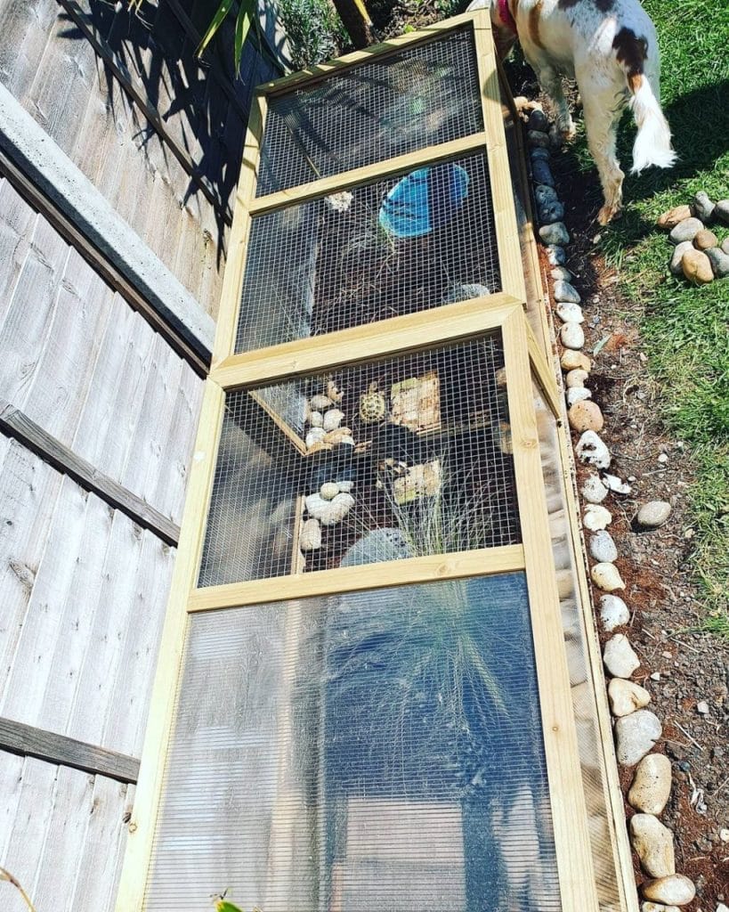 This setup runs along a fence, using vertical space wisely. It’s fully enclosed with fine mesh to protect from predators, and the clear roof section lets in sunlight. Rocks, plants, and shade zones are spaced throughout to encourage movement.