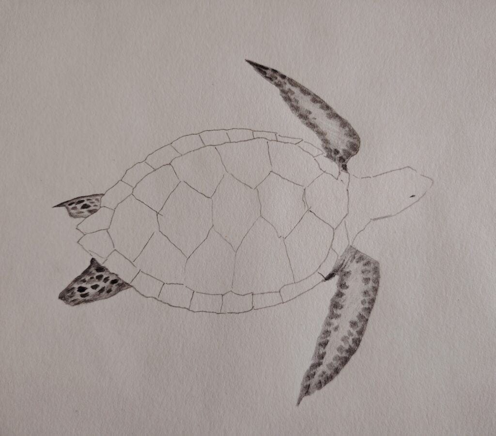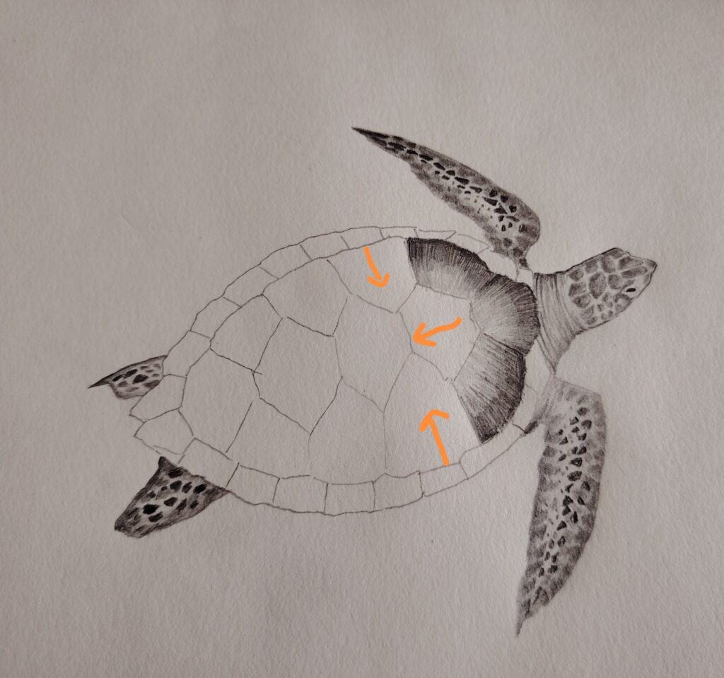 Around the edges of the flippers, we would put darker shadows with a 2B pencil.