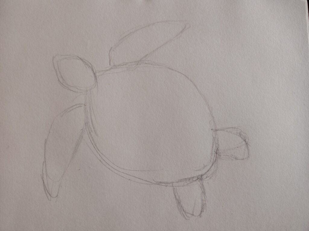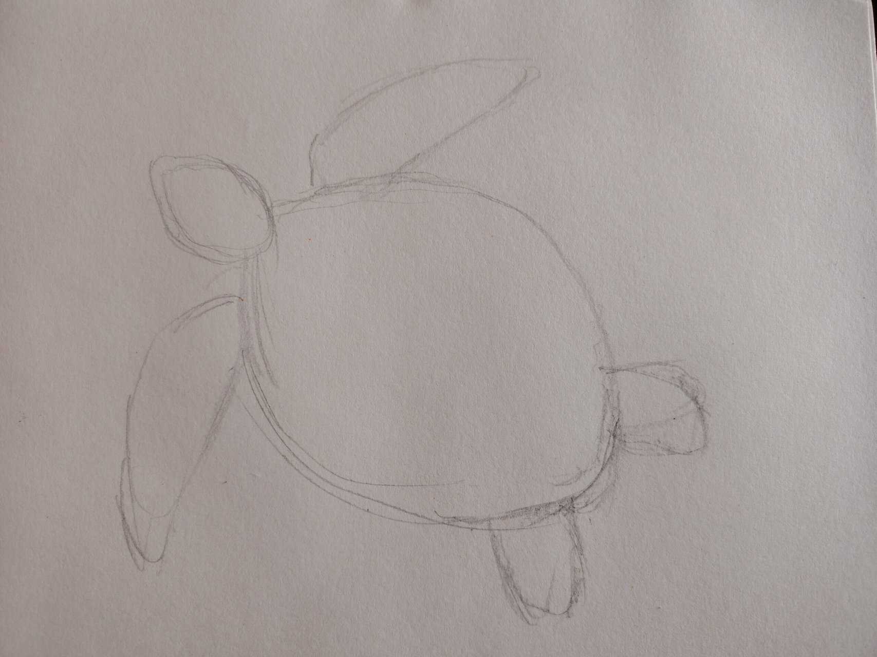 Sketch the basic shapes of the turtle’s body and shell using circles, ovals, and rectangles, following the reference closely.