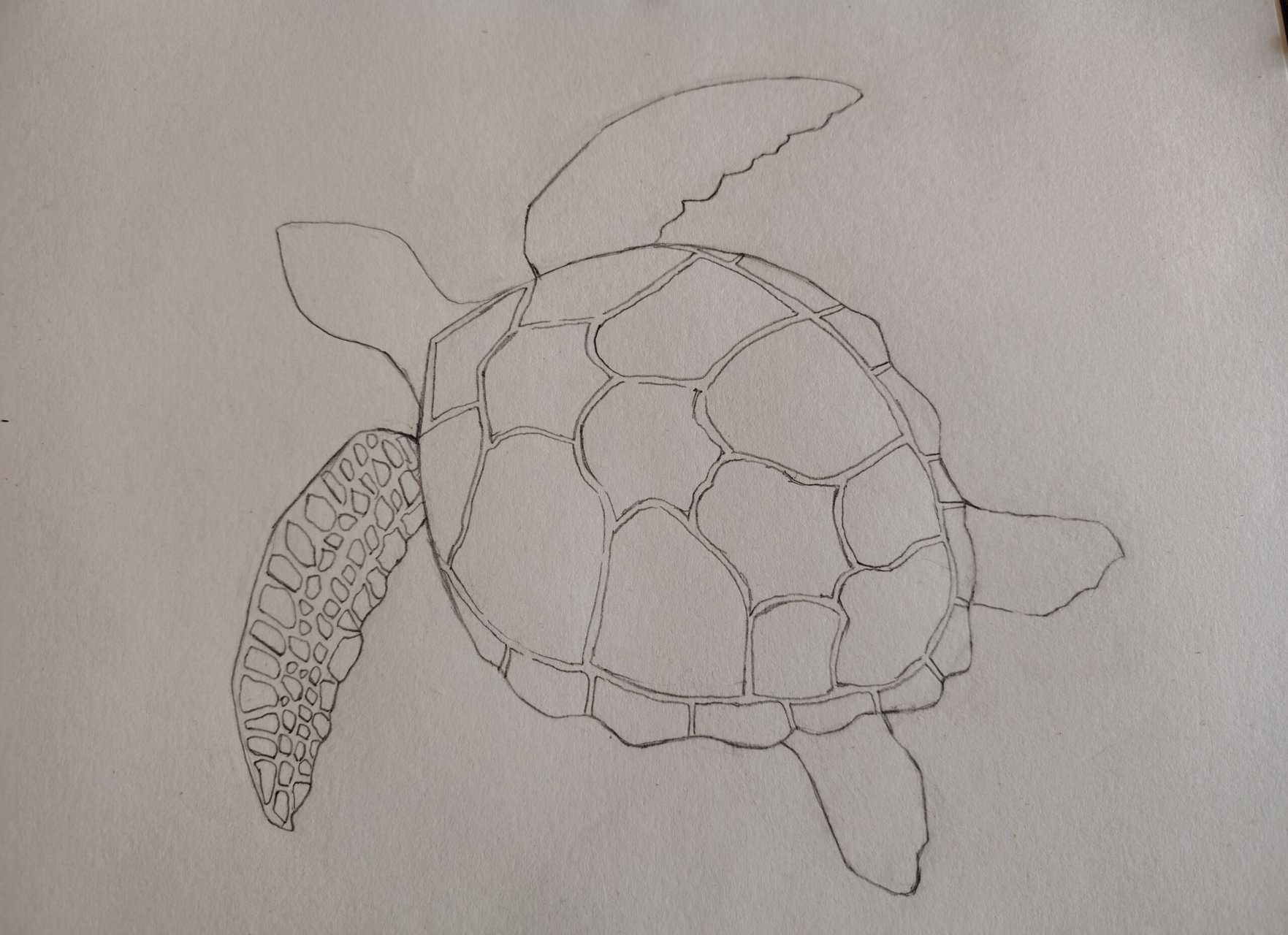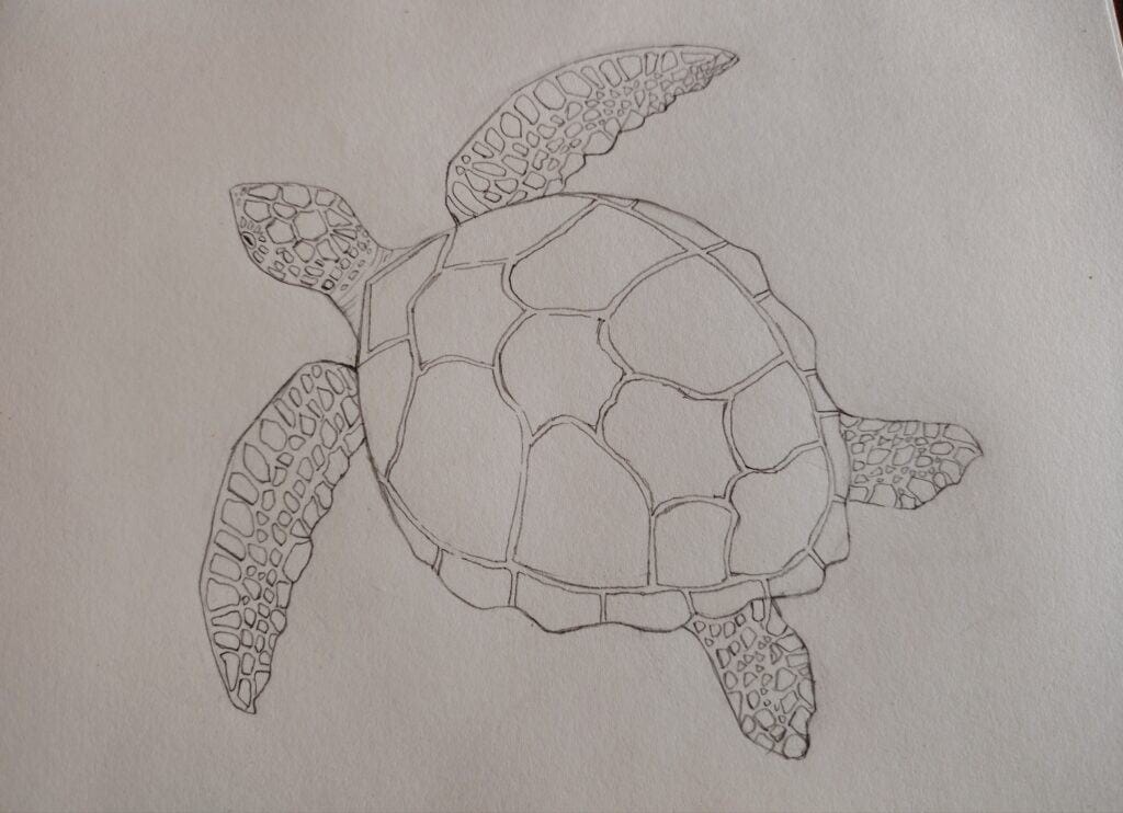 Clean up the sketch by erasing any remaining guidelines, leaving behind a clear outline of the turtle.