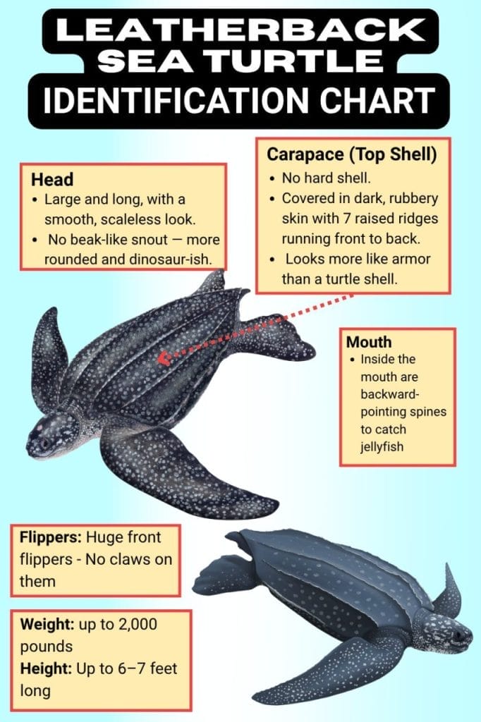 - No hard shell at all? → Leatherback (soft, leathery with 7 ridges)