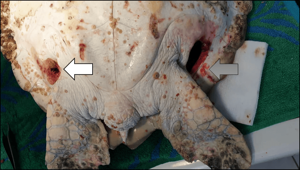 When a boat propeller hits a turtle, it creates these distinctive parallel cuts across their shell. The turtle either dies immediately or… well, they become part of what researchers call the “walking wounded.”