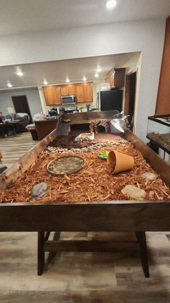 This setup turns a large wooden table into a tortoise paradise, with different zones for basking, burrowing, and roaming. There’s a water dish, a hide, bark chips, and even a dirt mound for digging.