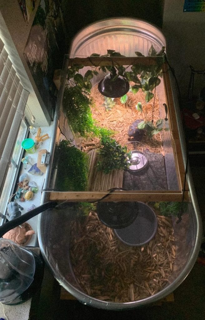 This enclosure uses a metal stock tank with a clear top and jungle-style greenery to create a lush home. The lighting brings out the plants and creates a cozy vibe.