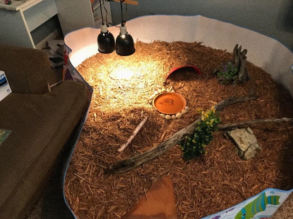 This setup uses a kiddie pool to give a tortoise lots of room indoors. It’s filled with mulch, branches, a hide, and simple lighting hung above.