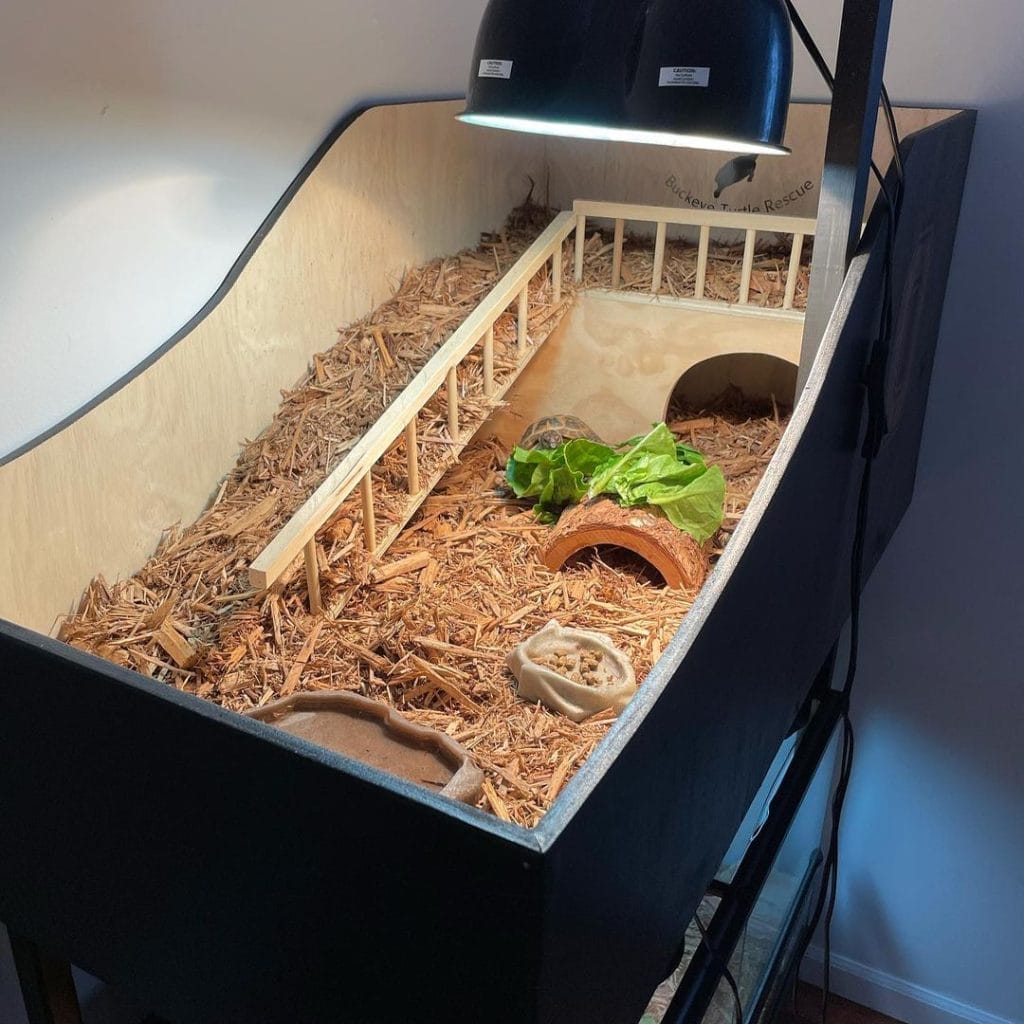 It blends right into the living room. Looks like furniture—but it’s actually a fully decked-out tortoise habitat.