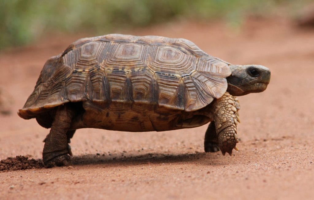 Natural predators include birds of prey, mammals like mongoose and jackals, and humans. The tortoise’s hinged shell serves as an effective defense mechanism, allowing it to protect vulnerable body parts by closing its shell tightly.