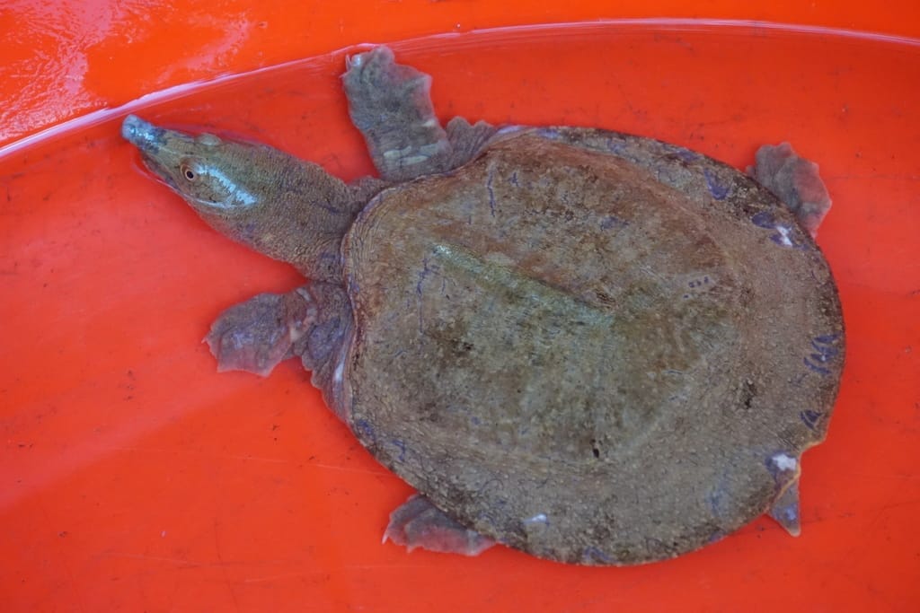 This turtle is relatively small compared to its close relatives, with a flat, leathery shell that lacks the hard scutes seen in most turtles. Its carapace is olive to brownish with lighter spots, blending well with muddy environments. The head is streamlined with a pointed snout and large nostrils, ideal for its aquatic lifestyle.