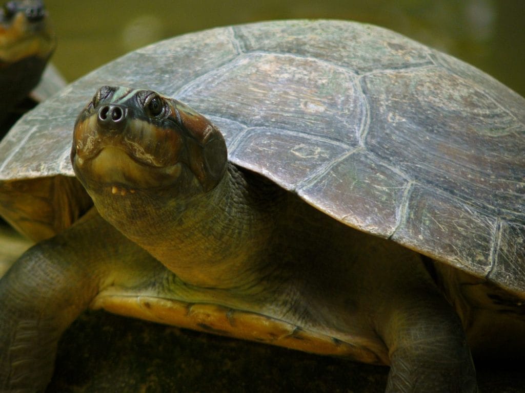 Adult Arrau turtles have broad, smooth, and flattened carapaces that can grow over 80 cm in length. The color ranges from dark brown to olive, and their limbs are strong and paddle-like for swimming.