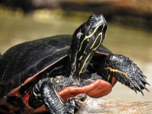The Eastern River Cooter has a dark olive to black carapace with yellow to orange swirling patterns. Its plastron is usually yellow with dark markings. The head and limbs feature yellow stripes.