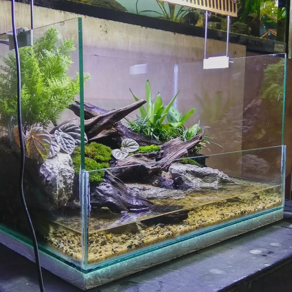 | Materials | Three glass tank, metal rack, logs, sand, plants |