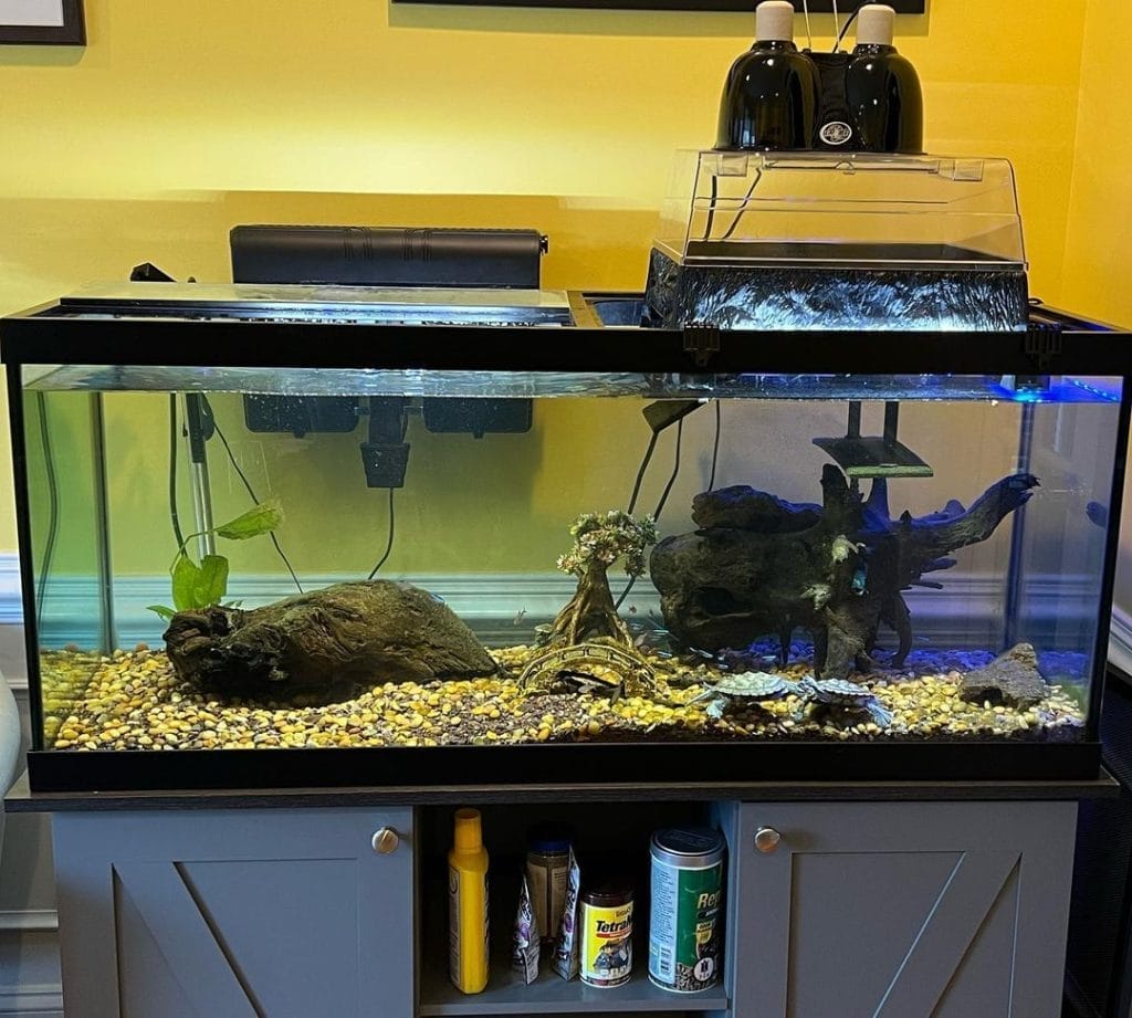 This simplistic tank design offers a tranquil environment for your prized turtles to flourish by putting an emphasis on comfort, practicality, and natural inclinations.