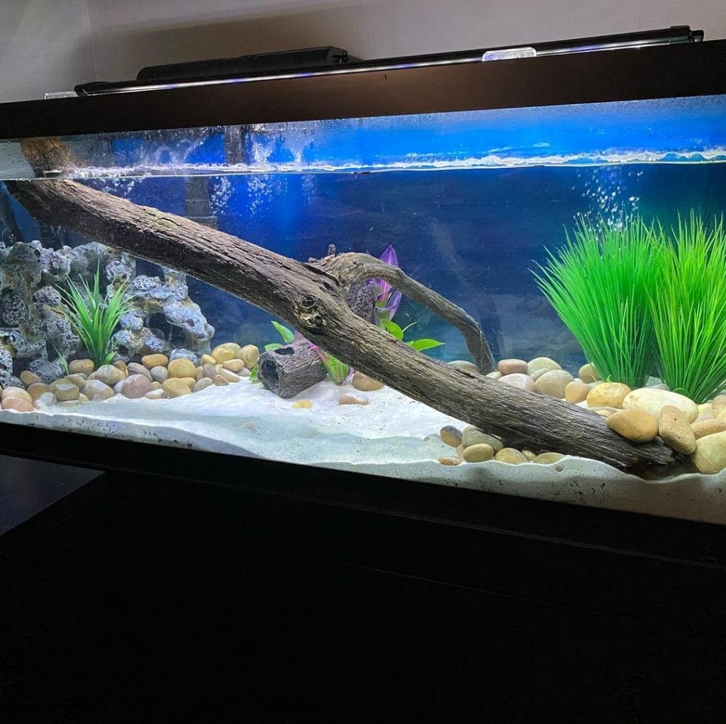 | Materials | Small pebbles, two large logs, above tank dock, filter, and lamps |