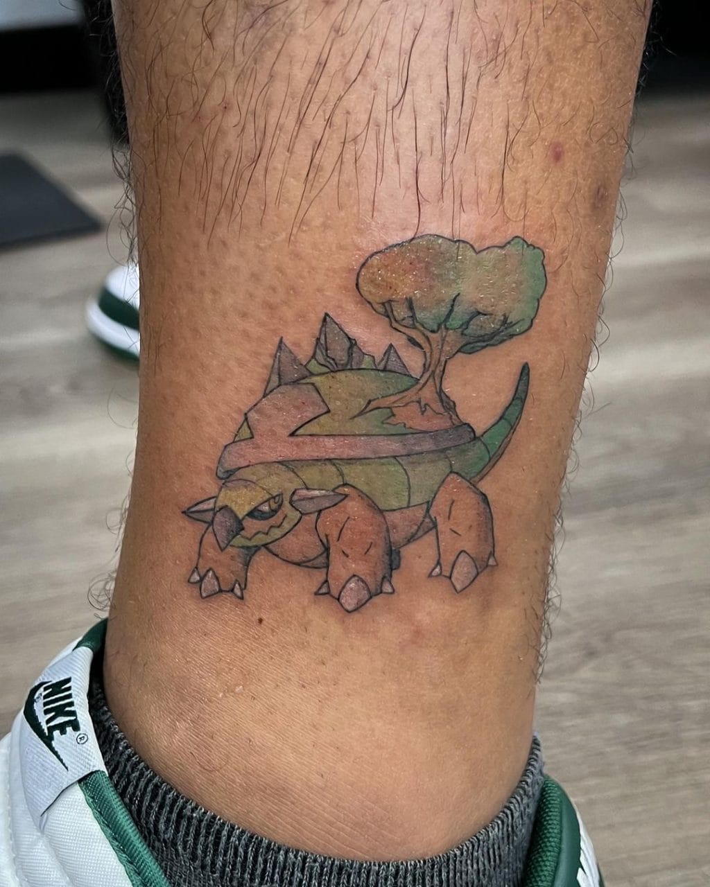 Black, yellow, and orange are combined on the head, neck, and front legs of the tattoo, giving it a contemporary and energetic feel.  “Modern Dinosaur” provides a potent illustration of the tortoise’s eternal appeal and how it has persisted throughout time.