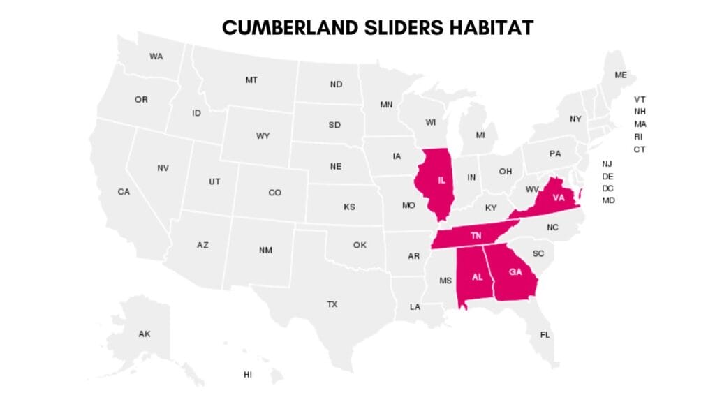 Nowadays, the Cumberland sliders are also seen in the Mississippi River, Alabama, Georgia, and Illinois. These turtles will thrive in any muddy area with low vegetation.