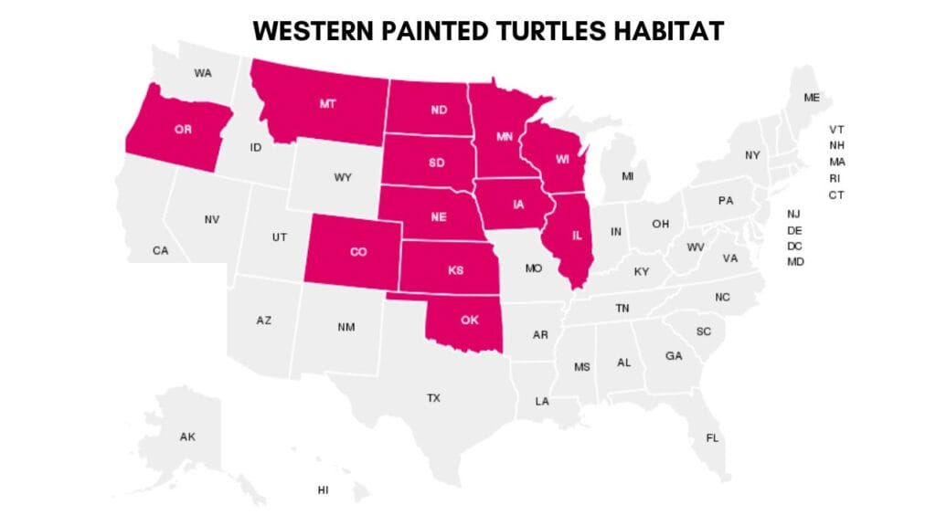 The Western painted turtles are found mainly in the Southern part of Eastern Canada and the western parts of the USA. States with western painted turtle populations are,