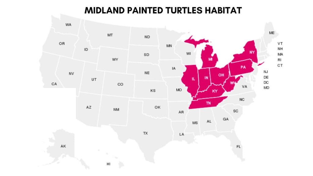 The midland painted turtles are native to both Canada and USA. In the USA, the species is vastly found in the below areas,